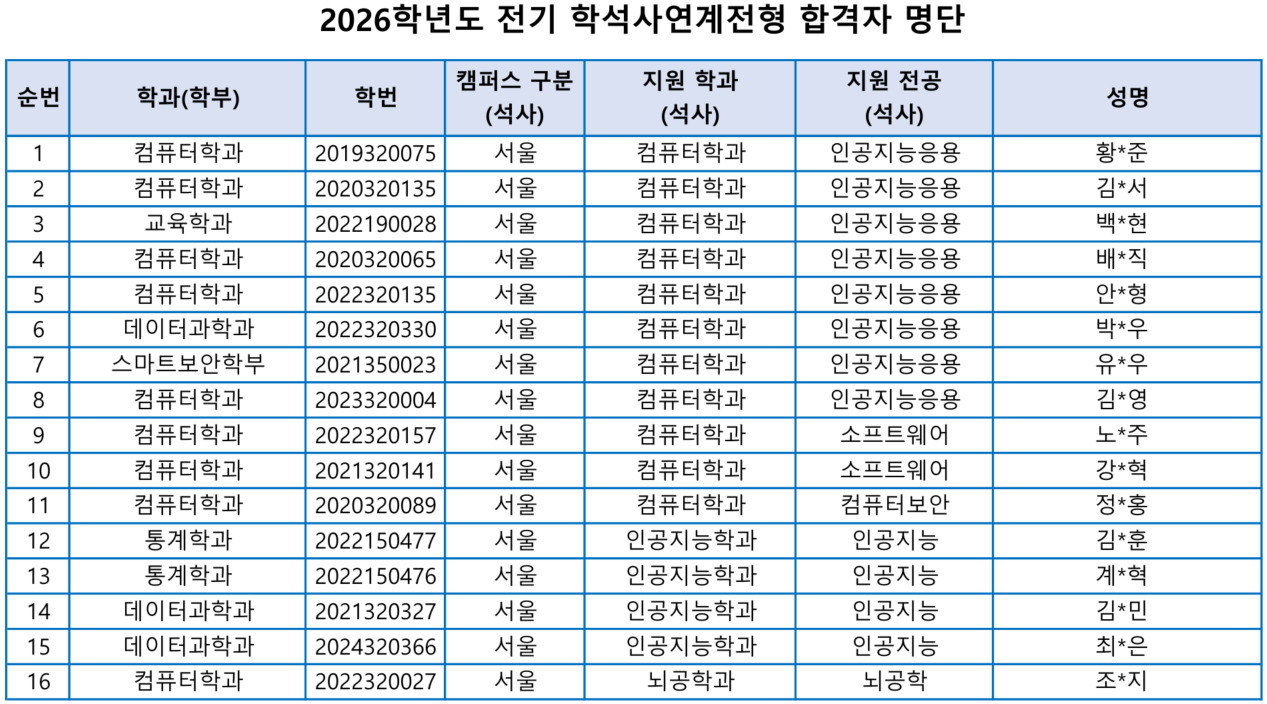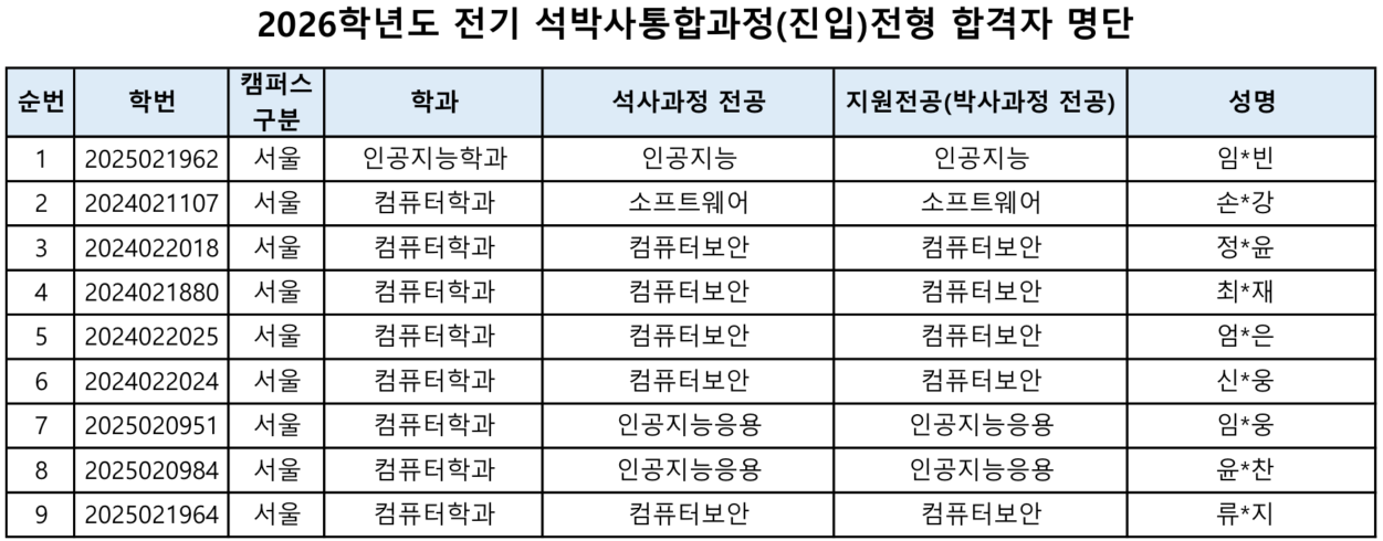 2026학년도 전기 석박사통합과정(진입) 및 학석사연계 전형 합격자를 아래와 같이 안내합니다.